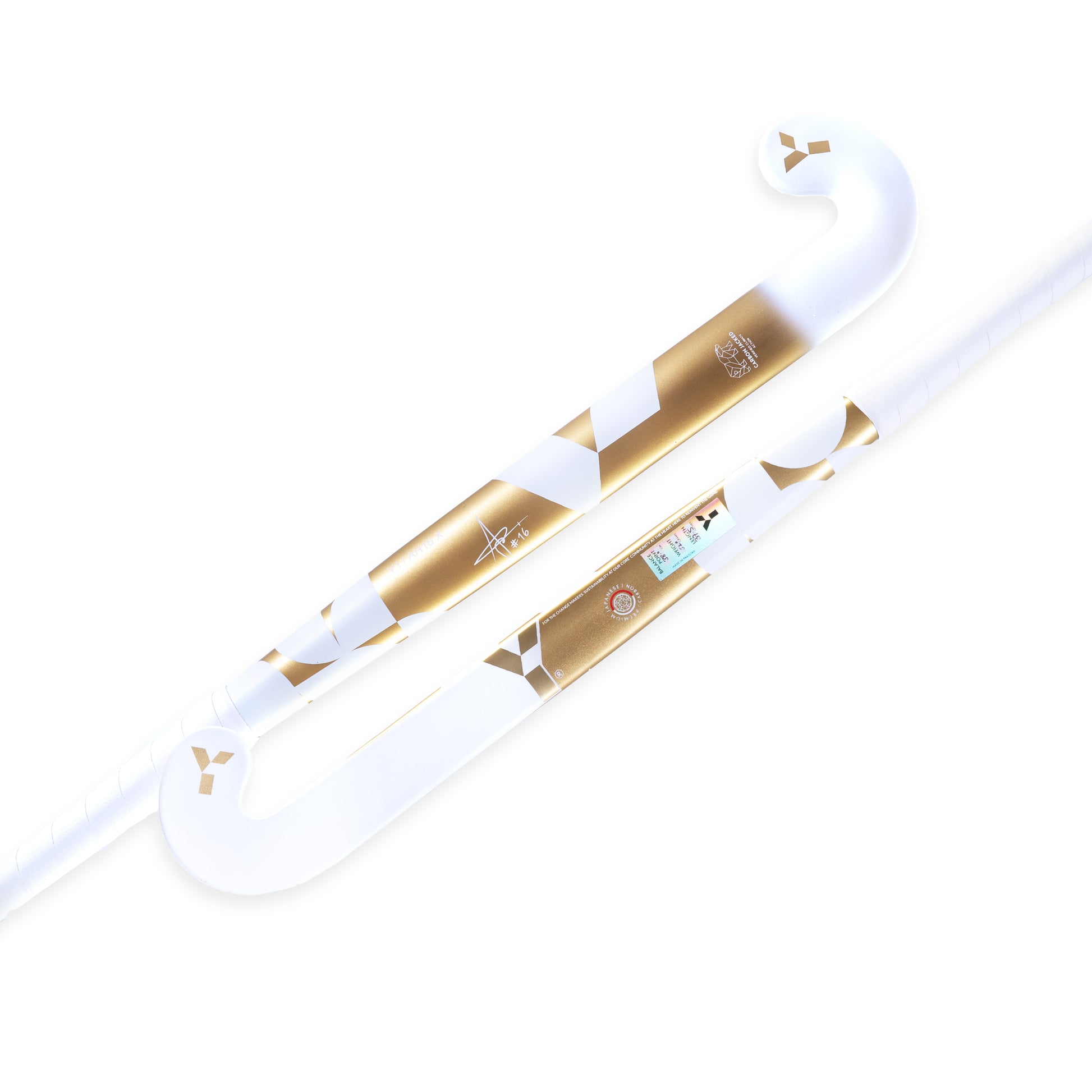 Designed in collaboration with our very own Alex Hendrickx, the AH16 boasts his favourite shape, the LB, and also his classic gold & white aesthetic, with his preferred all-white stick face for disguise when drag flicking.